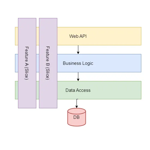 But instead of separating code into horizontal layers like API, Business Logic, and Data Access Layer, you group it by business capability, such as CreateOrder or RegisterUser.